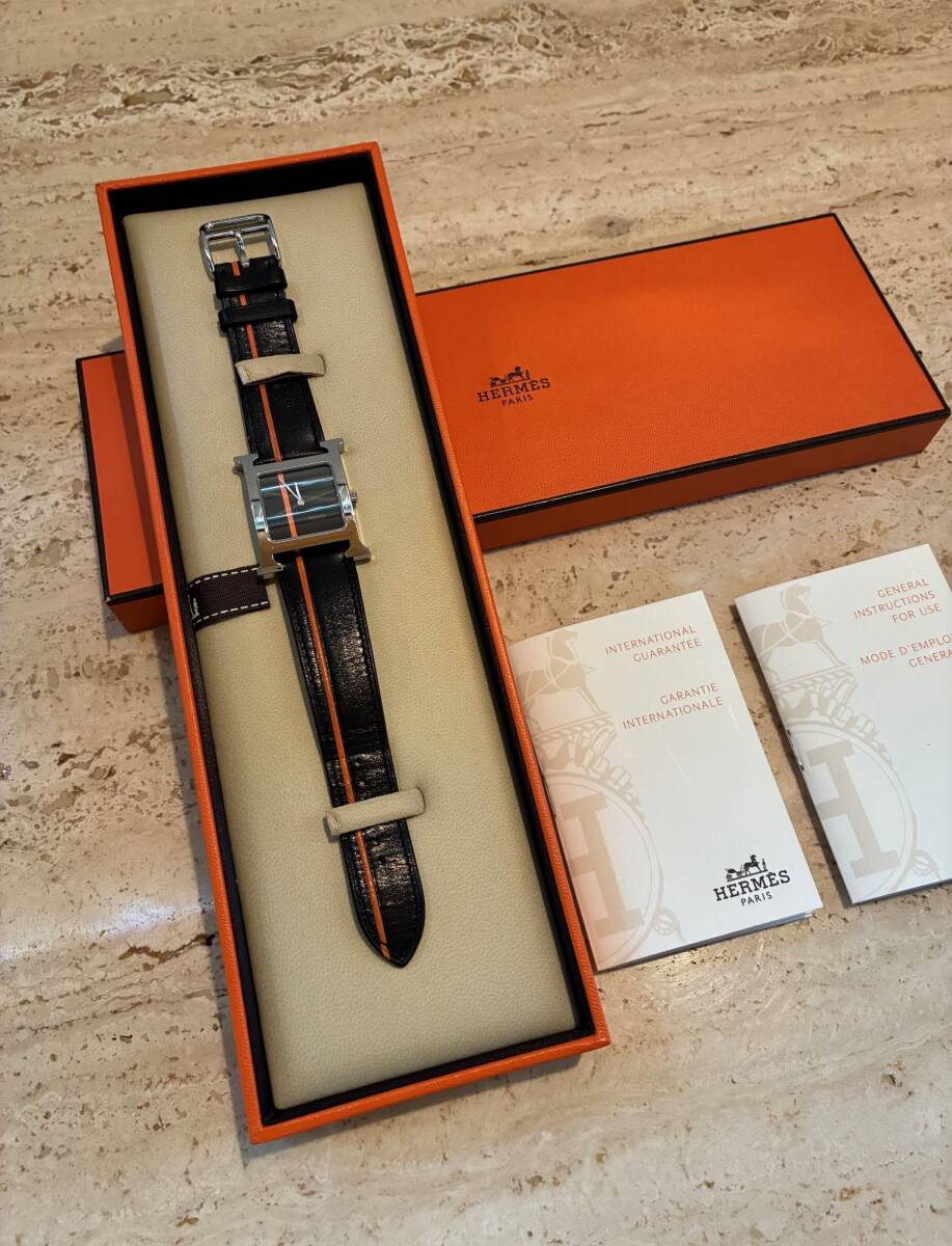 - HERMES エルメス Hウォッチ 時計 ブラック 黒 オレンジ レザー 箱 保証書付
