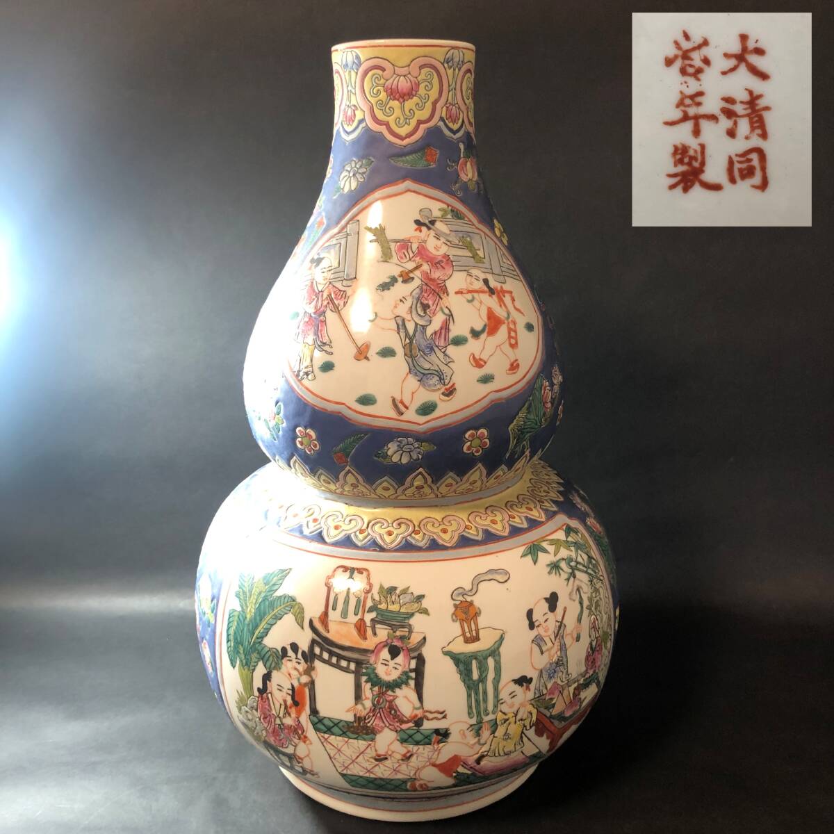 - 中国古玩 中国美術 粉彩 色絵 唐子に文様 瓢型 花瓶 花入 置物 大清同治年製 中国骨董