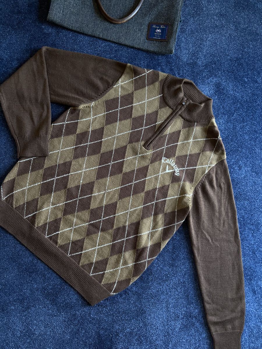 > 超美品 定価13,200円 Callaway キャロウェイ ゴルフウェア 豪華ロゴ ブラウン系アーガイル ハーフジップ ニット セーター sizeL