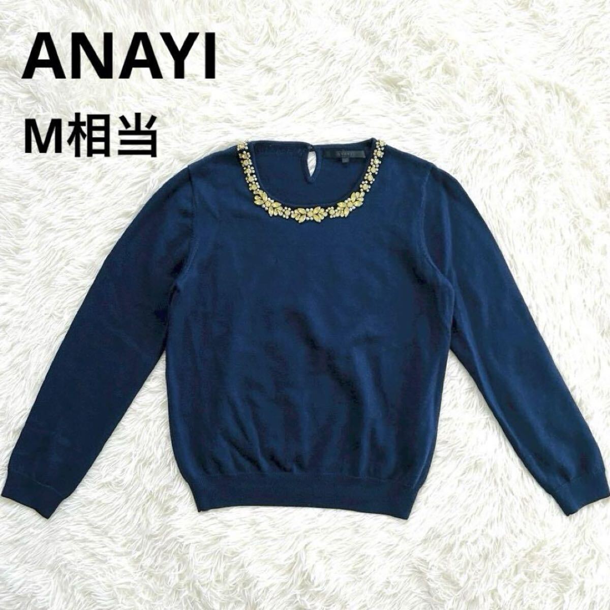 - 大特価 ANAYI ウール100% ニット セーター 華やか ビジュー 長袖 アナイ M レディース服 秋服 冬服 ネイビー おしゃれ