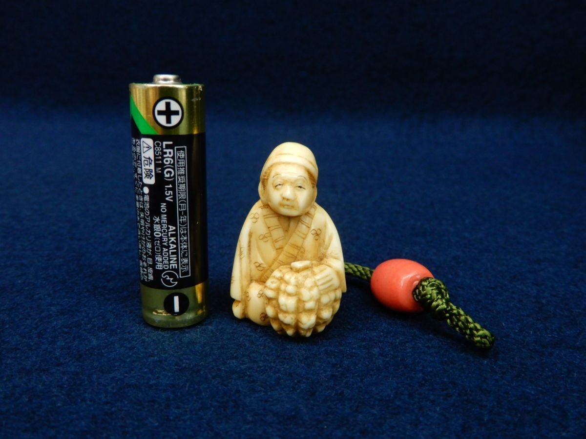 - ★根付12 骨彫 在銘 光之「翁之図」珊瑚緒締め★提げ物/消費税0円