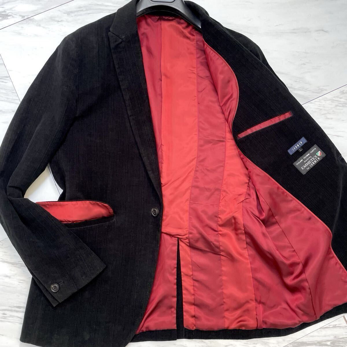 > 美品/希少L●ジュンメン【鮮烈の裏地 レッド】JUNMEN テーラードジャケット ブレザー ベロア調 イタリア製高級生地 EMMETEX 黒 ブラック