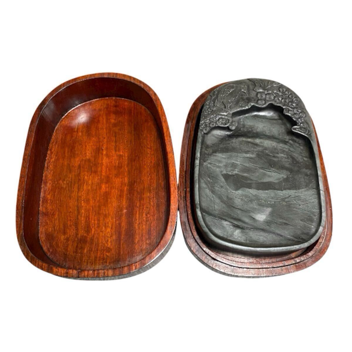 - 中国 古硯 八吋 石紋 あり 唐木箱 付き 厚さ 5cm 松 鳥 端渓硯 歙州硯 唐物 唐硯 文房四宝 古玩 骨董品 美術 書道具 書 硯 文房具