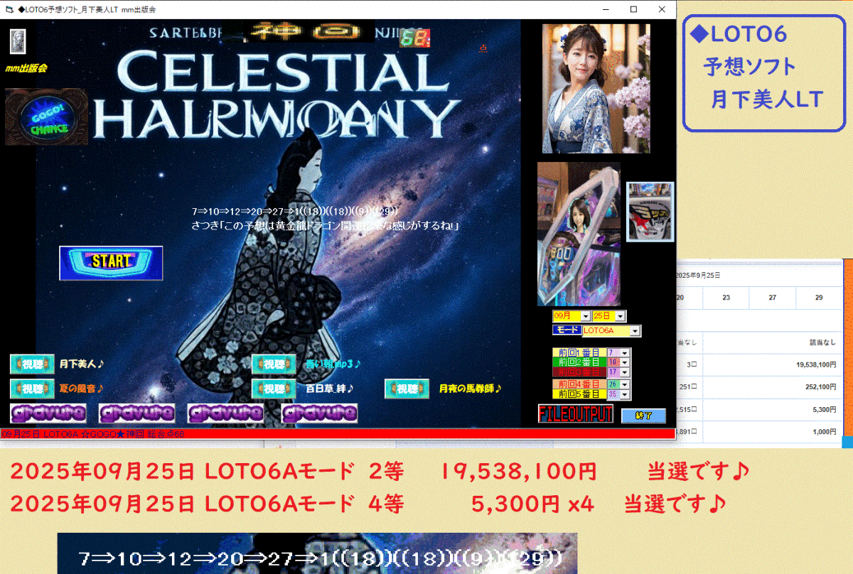 秋の新作 [◆LOTO6予想ソフト_月下美人LT] ロト予想ソフトをご案内申し上げます。 最強ソフトのロト6 フォーメーション予想版シリーズがまた登場! インストラクターのさつきちゃんが高額当選を予感!!!他ソフトでも、この「さつきちゃん」コラボは、ご案内後に1等高額当選が出ていることでも、有名になっています。2025年09月25日 LOTO6Aモード 2等 19,538,100円 当選です♪2025年09月25日 LOTO6Aモード 4等 5,300円 x4 当選です♪ 2025年08月14日 LOTO6Aモード 5等 1,000円 当選です♪2025年08月07日 LOTO6Aモード 1等 200,000,000円 (2億) 当選です♪2025年08月07日 LOTO6Aモード 3等 480,800円 x3 当選です♪ もしや、さつきちゃんって、超ラッキーメーカーですか?予想中に新曲「百日草_絆」や「月夜の馬券師」が流れると超激熱です!!!「ラッキートリガー」発動で、3000万円以上当選の87%期待度になります。 このスペックは、ロト予想界史上で歴史的にも最強仕様の名機となります。今主流の「先ばれ告知音」が鳴れば、更に高額当選濃厚!特にロト6のインストラクターのアイドル?!さつきちゃんが「神回」を予告・・・この日は激熱!!2025年09月25日 LOTO6Aモード 2等 19,538,100円 当選です♪2025年09月25日 LOTO6Aモード 4等 5,300円 x4 当選です♪ [◆LOTO6予想ソフト_月下美人LT]09月25日 LOTO6A ☆GOGO★神回 総合点68 [◆LOTO6予想ソフト_月下美人LT][7⇒10⇒12⇒20⇒27⇒1((18))((18))((9))((29))][◆LOTO6予想ソフト_月下美人LT][さつき「この予想は月下美人な感じがするね!」][◆LOTO6予想ソフト_月下美人LT]さつき「今日も期待するわよ♪」2025年08月07日 LOTO6Aモード 1等 200,000,000円 (2億) 当選です♪2025年08月07日 LOTO6Aモード 3等 480,800円 x3 当選です♪ 2025年08月14日 LOTO6Aモード 5等 1,000円 当選です♪[◆LOTO6予想ソフト_月下美人LT]08月14日 LOTO6A ☆GOGO★激熱 総合点76 購入しないかな[◆LOTO6予想ソフト_月下美人LT][9⇒18⇒26⇒32⇒29⇒35((7))((33))((43))][◆LOTO6予想ソフト_月下美人LT][さつき「この予想は月下美人な感じがするね!」][◆LOTO6予想ソフト_月下美人LT]さつき「今日も期待するわよ♪」2025年08月07日 LOTO6Aモード 1等 200,000,000円 (2億) 当選です♪2025年08月07日 LOTO6Aモード 3等 480,800円 x3 当選です♪ [◆LOTO6予想ソフト_月下美人LT]08月07日 LOTO6A ★GOGO☆金色になれミ 総合点89 やや控えめに! [◆LOTO6予想ソフト_月下美人LT][1⇒20⇒28⇒29⇒31⇒35((42))((30))((43))][◆LOTO6予想ソフト_月下美人LT][さつき「この予想は月下美人な感じがするね!」][◆LOTO6予想ソフト_月下美人LT]さつき「今日も期待するわよ♪」今回は、新機能、業界開発の機能を2つ搭載しています!二つ目が、「ラッキートリガー」です。3000万円以上当選の90%期待度になります。あなた様も、今日からでも、一つロトで楽しみを持つのも、どうですか。もうすでに人生が楽しく変わっています。今回は、特典グラビア さつきちゃんの画像が観れる機能が付いていますこのツールは、診断チェック機能を装備した、予想ソフトです。 1.買いたいロト券が、本当に信頼できるのか、ガチで勝負しても、大丈夫なのか? 2.買い目を数点に絞りたいが、有望な勝負できる数字を、知っておきたい。 3.ロト6で買いたいが、1、2点で勝負に適した買い目を知りたい。 要は、このソフト 一点一点の買い目の診断と、勝負になる絞った予想の買い目も出してくれます。 診断した買い目の総合の評価点数や、どんな勝負度合いが良いかの指示も出ます。実際に、どんな当て方を過去にこの予想ツールがしてきたのかを、ご説明いたします。こんなシンプルなツールで、こんなに高配当などが立て続けに当たるのですから、楽です。[[◆LOTO6予想ソフト_月下美人LTの具体的仕様な説明]]・このソフトは、パソコンWindows版の全てに対応しています。Xp Vista 7 8 8.1 10 11動作確認済み ・買い目は、全てのロト6基本 (予想にもボーナス数字を含むため)、LOTO6 3点~7点 です。・条件により、倍の数の買い目が出ることが御座います。基本点数とは異なる数の予想数になることがあります。・熱い予告の時に、さつきちゃん、★GOGO★ランプも点灯します。・新機能、業界開発の「先ばれ告知音」機能を搭載しています!・新機能、業界開発の「ラッキートリガー」発動で3000万円以上当選の87%期待度になります。・予想中に新曲「百日草_絆」や「黄金の龍が舞い降りる」が流れると超激熱です!!!・さつきちゃんが、本来持つあなたの強運を引き出そうと暖かい励ましでメッセージを言ってくれます。・特典グラビア さつきちゃんの画像が観れる機能が付いています 【演出別期待度】 さつき☆ さつき実写☆☆ レインボー☆☆☆ ・買い目の一つ一つについて診断が出来る予想ツールです。・診断だけでなく、LOTO6の勝負の度合いも指南してくれます。・予想ソフトは、過去の当選数字が閲覧、参照などができれば、だれでも簡単に予想できます。・画面を見ての通り、入力箇所も3、4箇所程度で、マウスによる選択形式です。シンプルで簡単です。今だけ、特別にご奉仕価格にて、ご提供致します。 是非お薦めです♪[
