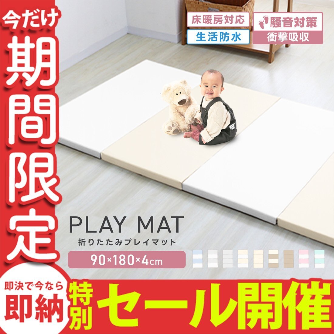 > 【数量限定セール】プレイマット 厚手 折りたたみ 大判 マット 赤ちゃん 床暖房対応 4cm 180cm フロアマット ノンホルム 防水 防音 軽量