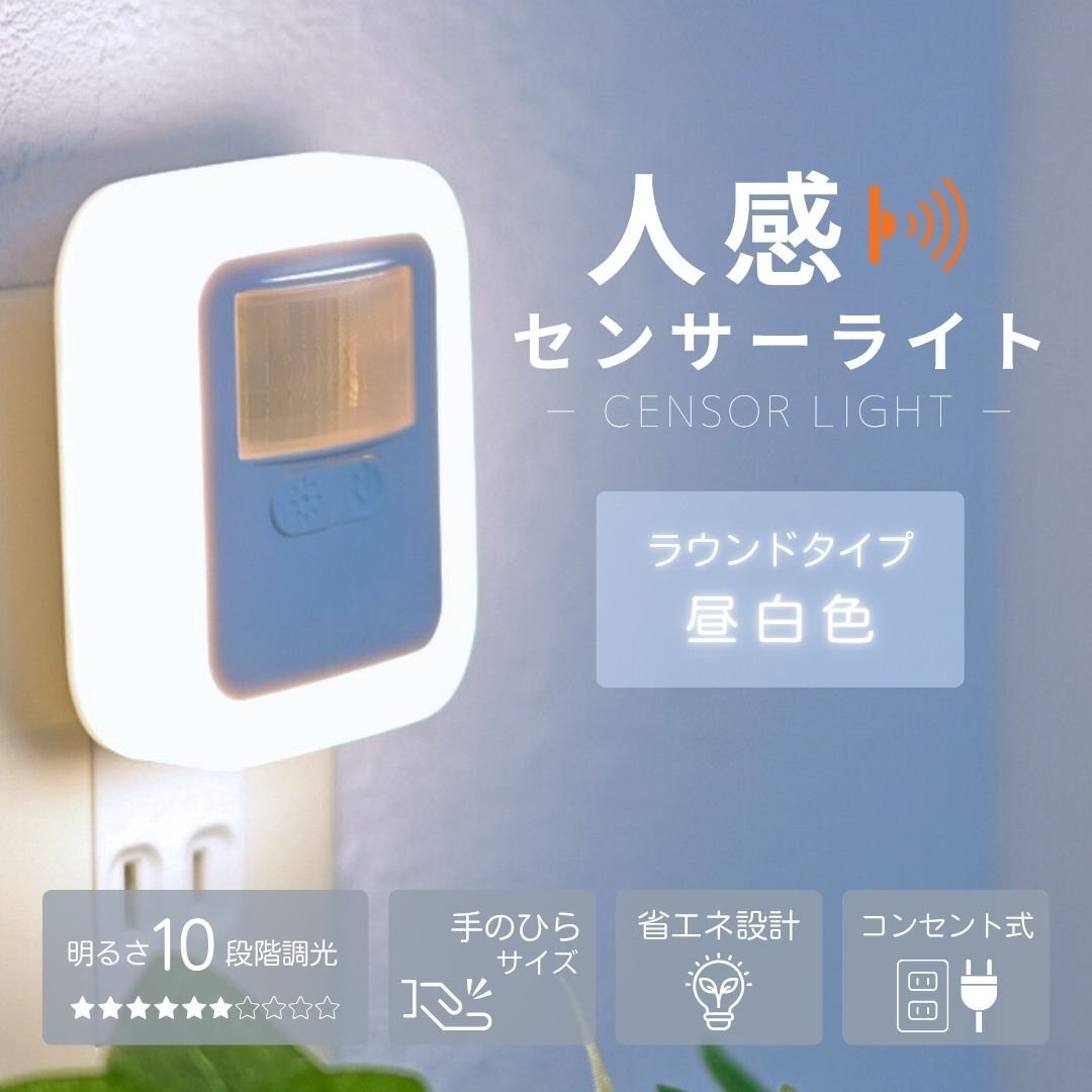- 【ラウンドタイプ/昼白色】人感センサーライト コンセント式 センサーライト 室内 フットライト 足元灯 屋内 人感センサー 調光 省エネ 防