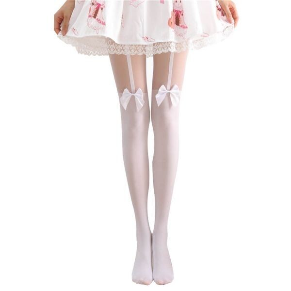 - フェイクニーハイストッキング 偽のガーターベルト ストッキング リボン付き ガーターベルト柄 白(0)