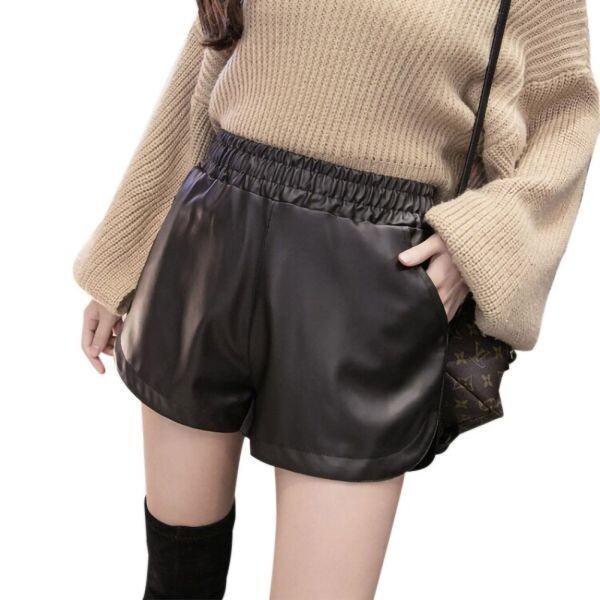 - ショートパンツ ブラック レディース ウェストゴム ポケット付き PUレザー ショート丈 フェイクレザー 3XLサイズ(0)