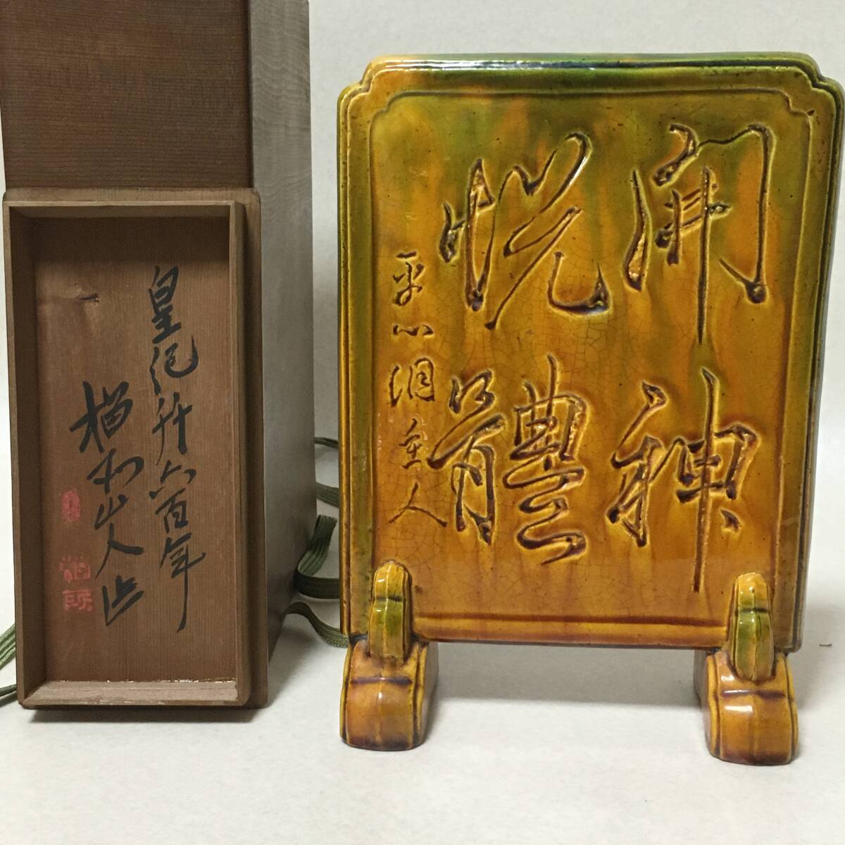 - E769 硯屏 銘あり 箱付き 1940年代 皇紀2600年奉頌記念 衝立 卓上屏風 置物 陶器
