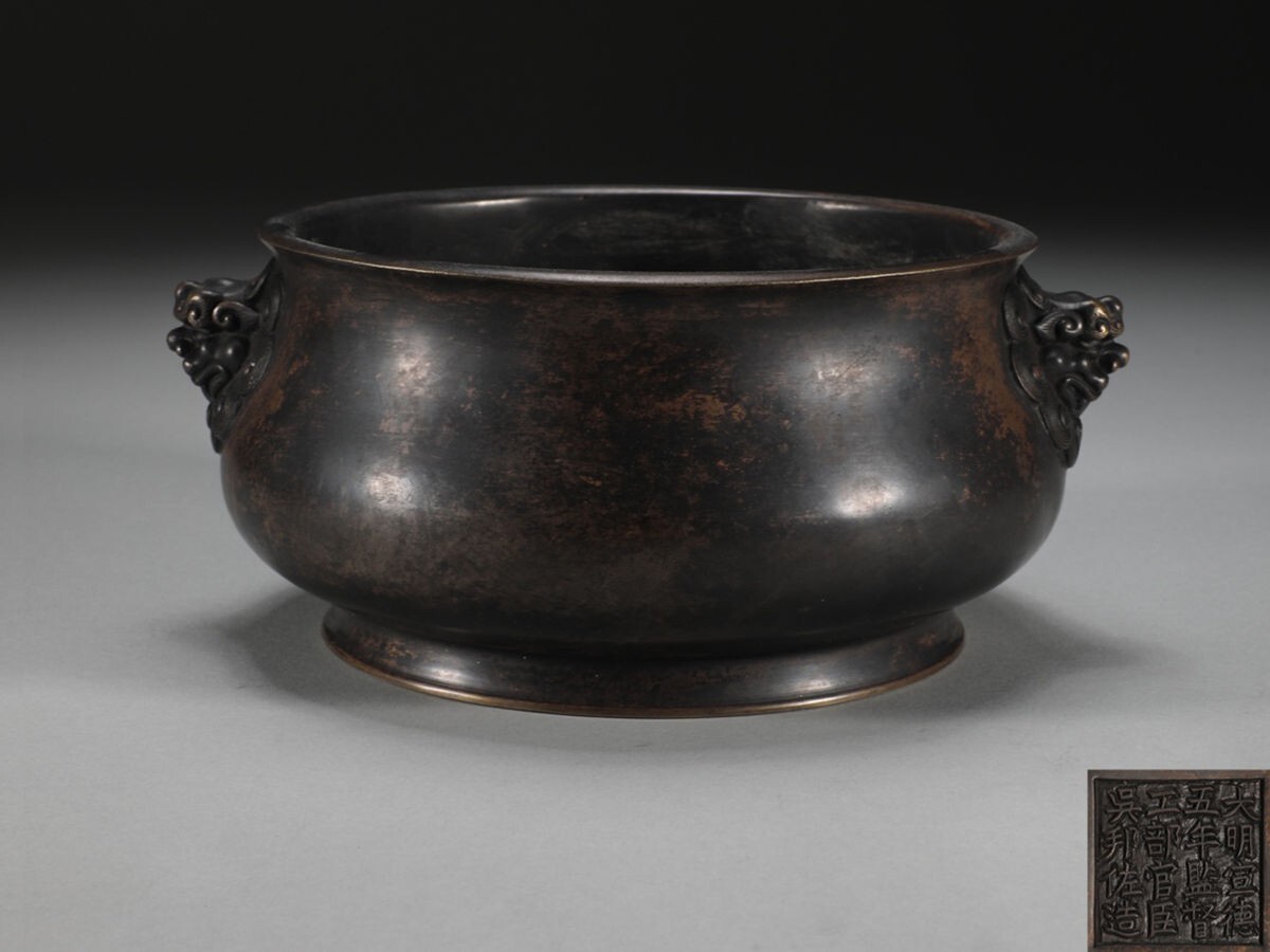 - 「大明宣徳五年監督工部官臣呉邦佐造 古銅彫 獅首耳 老銅香炉」旧銅器 置物擺件 賞物 中国古美術 旧蔵出