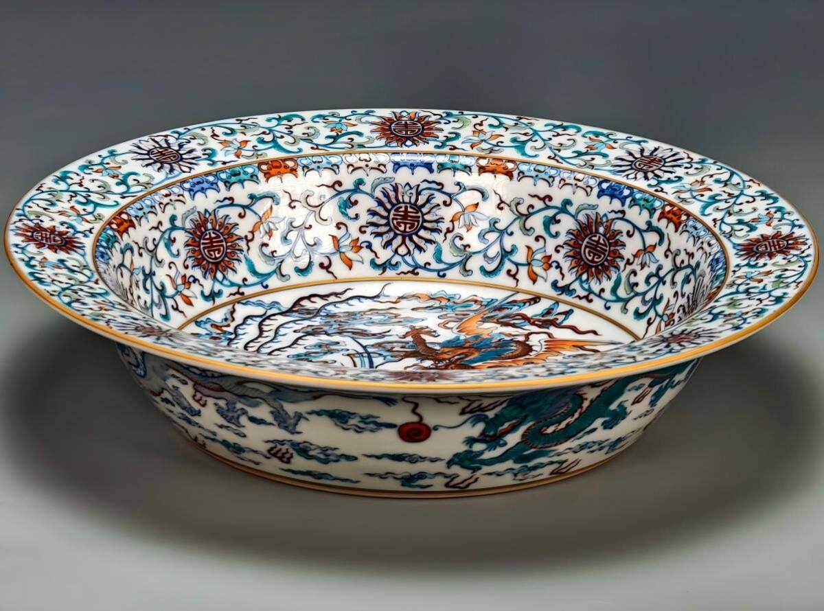 > 多宝閣 ■8609KH.9 人間国宝 中国磁器 中国骨董【清代乾隆年間の斗彩龍鳳文蔭縁盆】工芸品 施釉陶 陶芸 置物 收藏品 孤品
