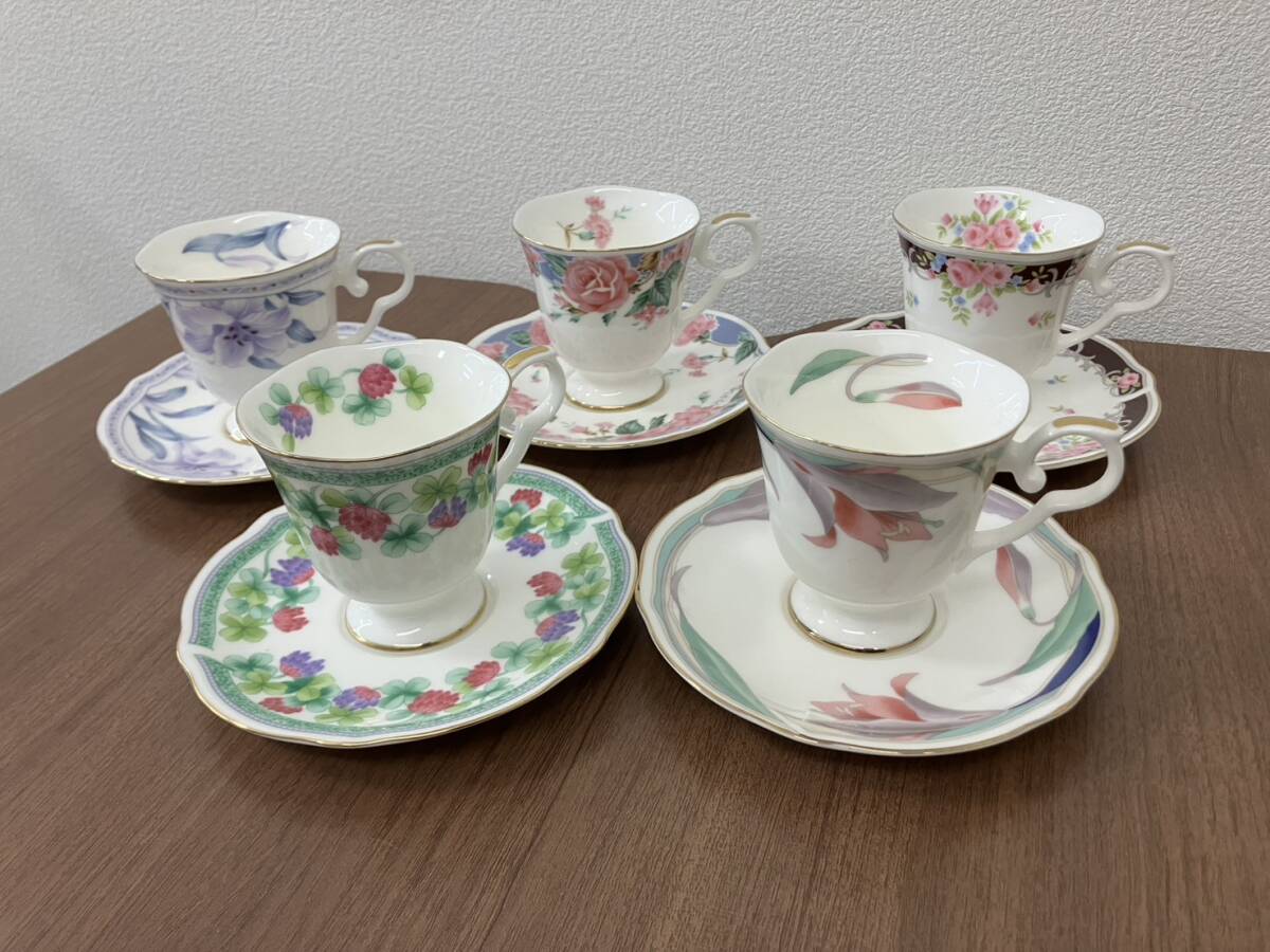 - 【C】*新古品*HOYA Bone China ティーカップ ソーサー 花柄 金彩 洋食器 5客セット 絵柄5種 昭和レトロ*