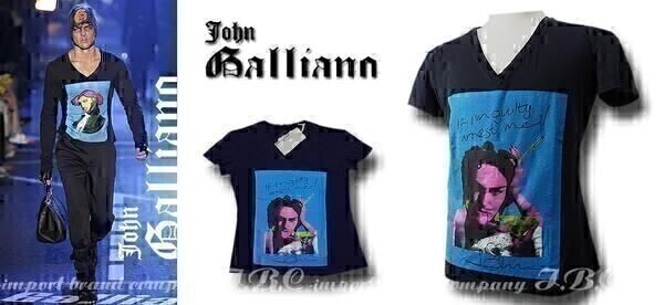 > 名作★galliano ジョンガリアーノ 人気のVネックプリントTシャツ しなやか素材で着心地◎ 黒ブラック SizeL【本物保証】入手困難廃盤モデル