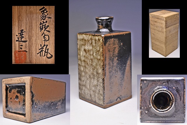> 島岡達三 ★ 象嵌 角瓶 ★ 共箱 ★ 人間国宝 ★ 上作 珍品 ★ 師: 浜田庄司 ★ 柿釉と象嵌を面で分けた意匠の希少手 ★ 民芸陶 益子 ★