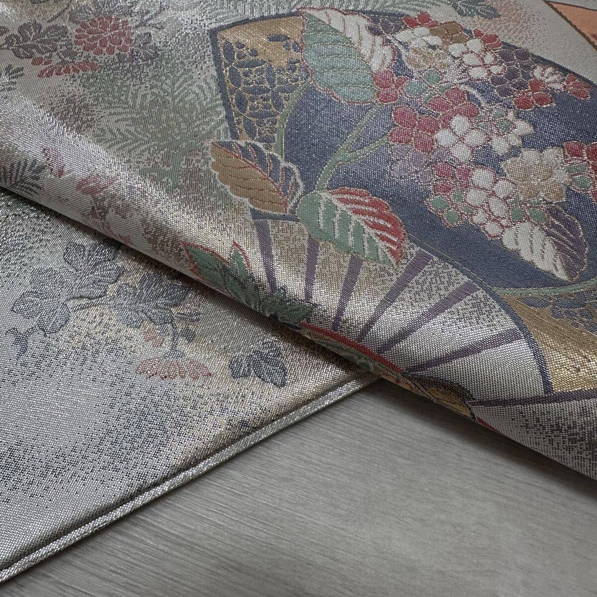 - 袋帯 扇に花模様の織出し 金銀彩 正絹 着物 W-4482