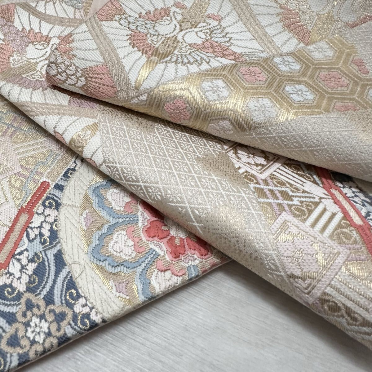 > 袋帯 唐織 金彩 丸に鳳凰 正倉院模様 向かい鶴 正絹 着物 W-4494