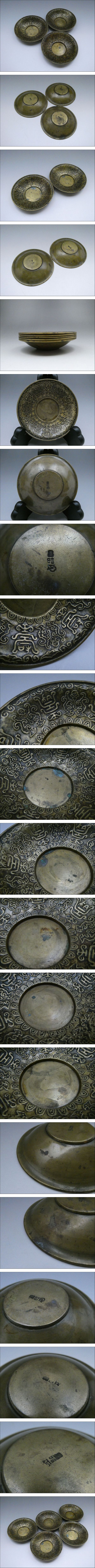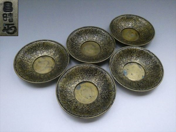 - ◆◇名越昌晴 昌晴銘 茶托 托子 古代文 黄銅 五客揃 茶器 茶道具◇◆
