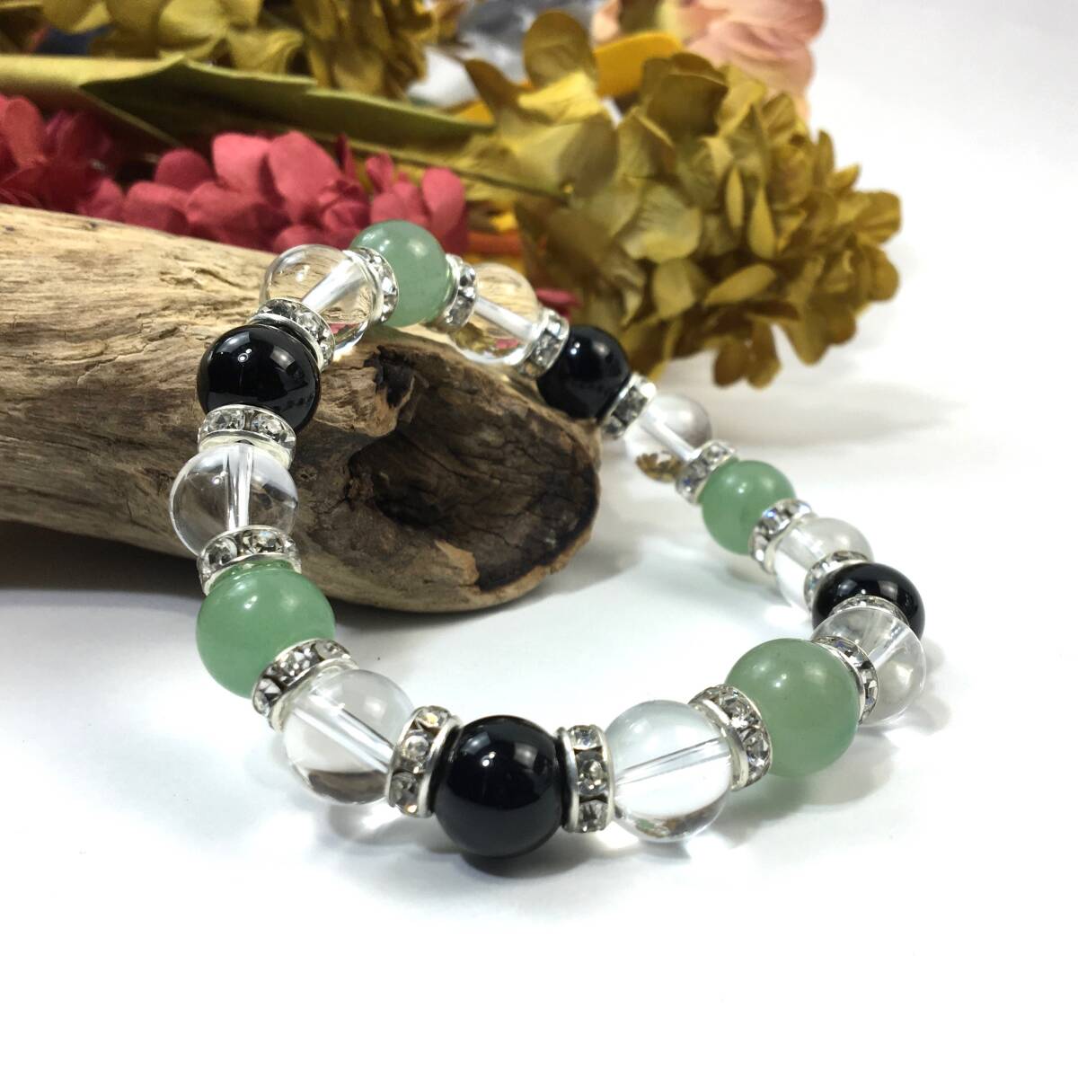 > アベンチュリン×水晶×オニキス パワーストーン ブレスレット 天然石ブレス (ロンデル: シルバー) 10mm メンズ・レディース