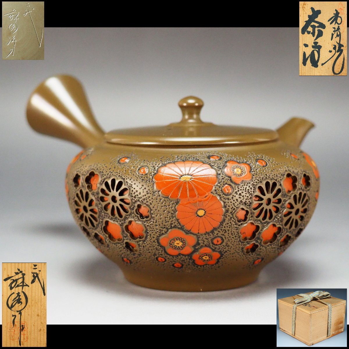 - 【治】常滑名工二代『間野舜園』作 常滑焼 彩色梅菊花彫急須☆共箱 朱泥/紫泥(検索:吉川雪堂 吉川壷堂 山田常山 山田宝生) 本物保証 BCA04
