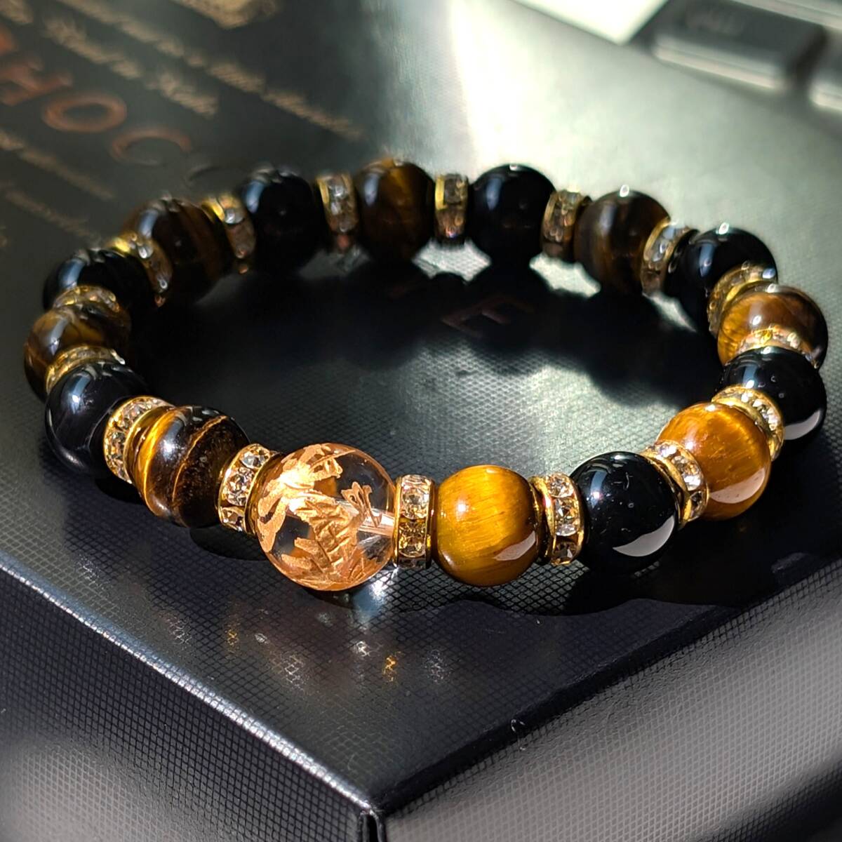 - 五本爪皇帝龍 本水晶 クォーツ トラ目石タイガーアイ オニキス ブレスレット 開運 天然石 数珠 風水 パワーストーン プレゼント ギフト