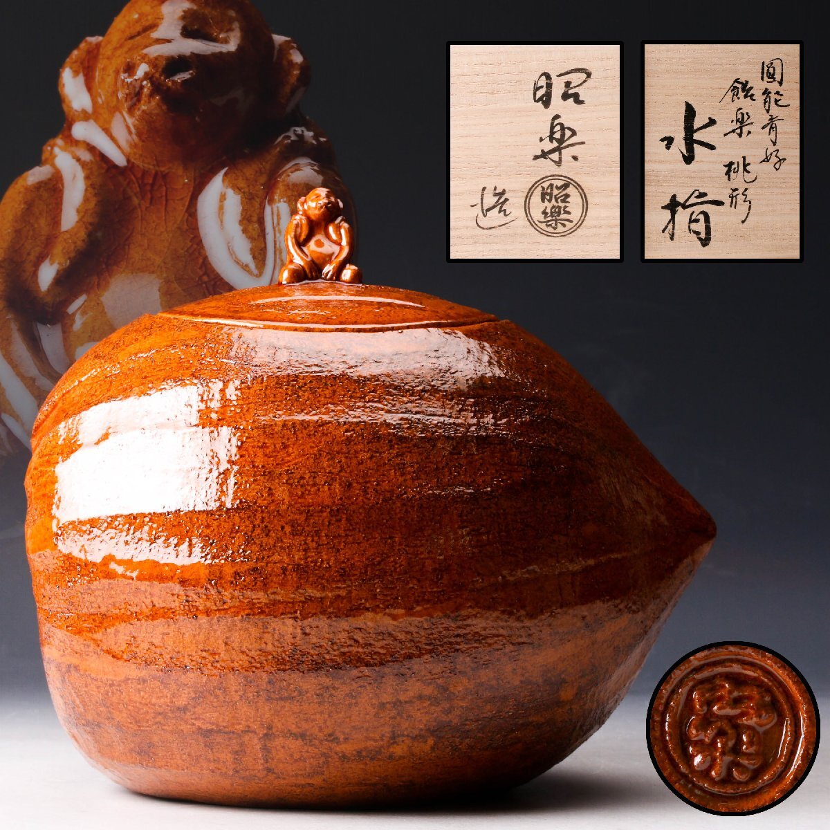 - 【佳香】佐々木昭楽 圓能斎好 飴楽桃形水指 共箱 共布 茶道具 本物保証