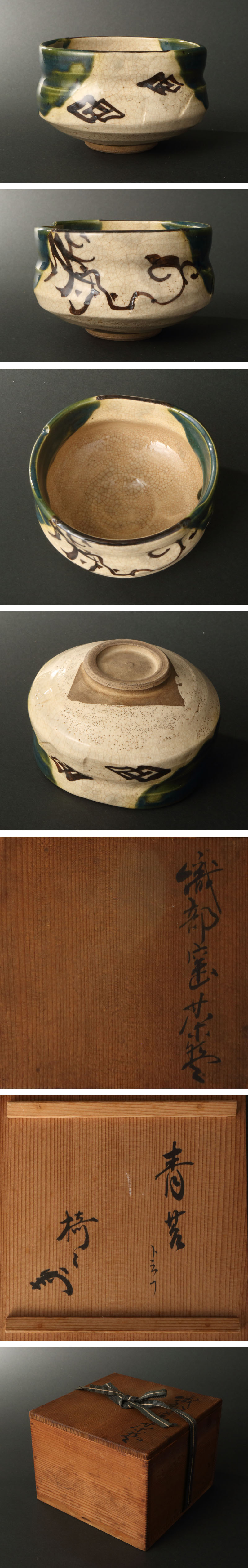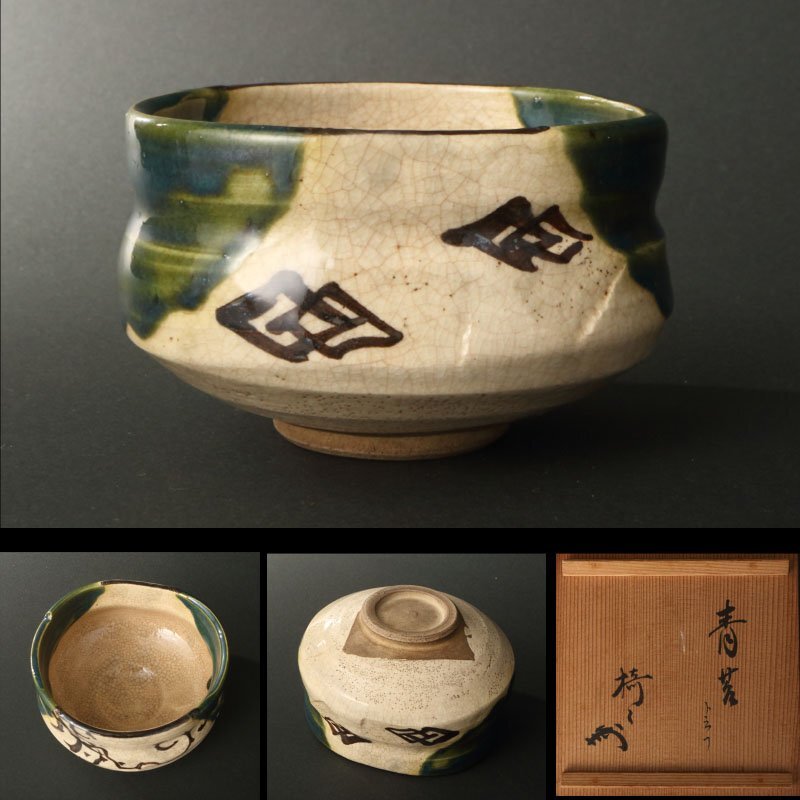 - 委託HK◇時代 織部茶碗 薮内猗々斎書付 「青苔」(茶道具 陶磁器 陶芸 美濃焼 織部焼 青織部 藪内流 家元 竹風紹智 鑑賞 茶事 茶席 )