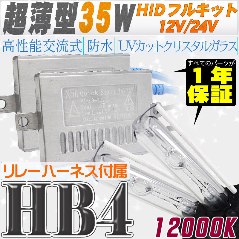 - 高性能 薄型HIDキット 35W HB4 リレー付 12000K 12V/24V 【交流式バラスト&クリスタルガラスバーナー】