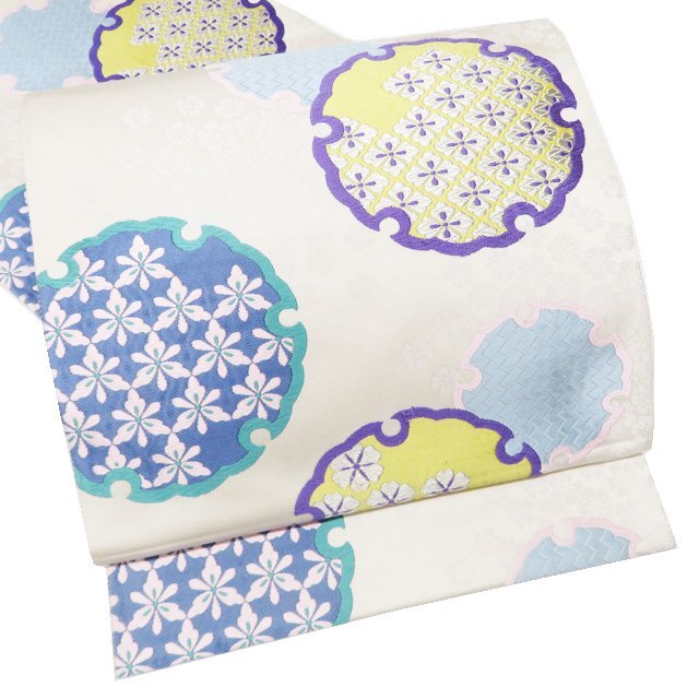 > 袋帯 中古 リサイクル 正絹 カジュアル 仕立て上がり 六通 雪輪模様 地模様 桜模様 銀糸 白色 多色 きもの北條 A1278-12