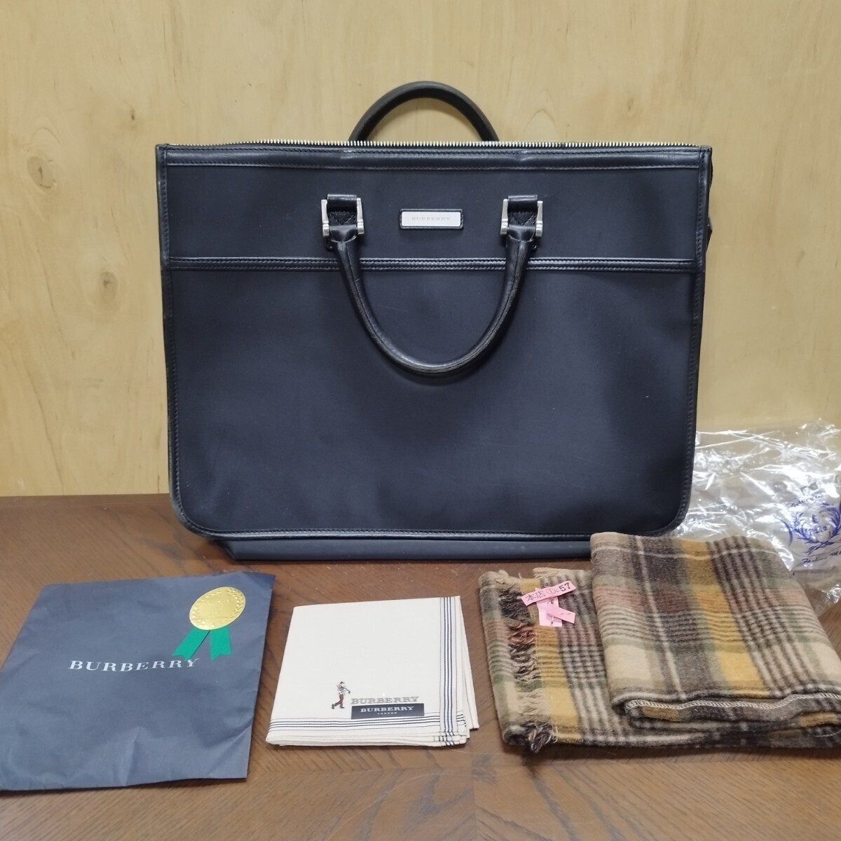 > 戸06b BURBERRY バーバリー ナイロン×レザー ハンドバッグ ビジネスバッグ ブリーフケース メンズ ブラック系 ハンカチ マフラー セット