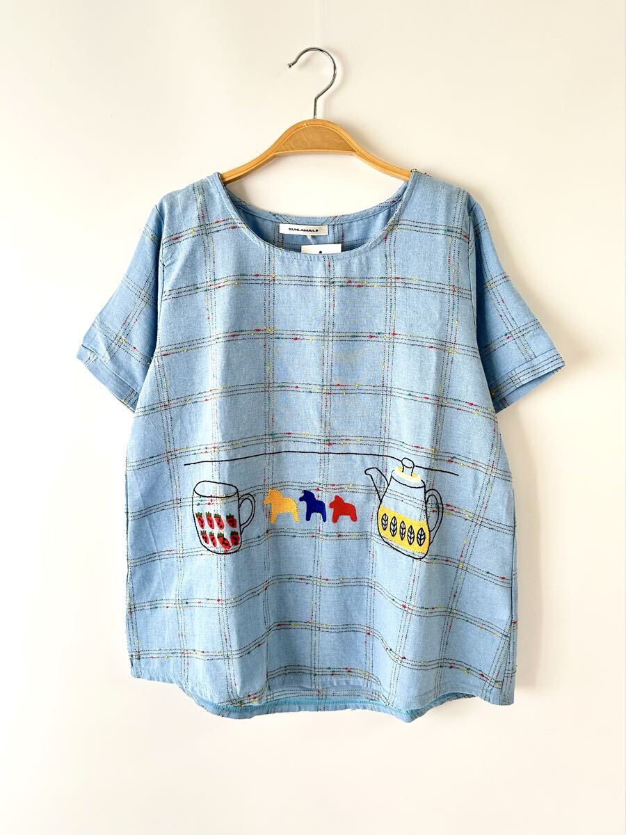 - 新品 ティーポットとカップ アップリケ刺繍 Tシャツ M~Lサイズ 半袖プルオーバー
