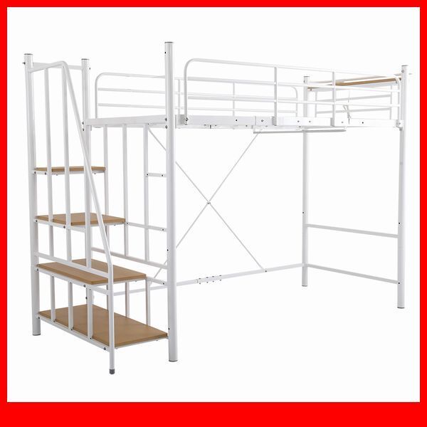 > ロフトベッド★ヴィンテージ風 高さ調整可能 階段付きロフトベッド シングル/宮棚 コンセント ハンガーパイプ/ハイ ミドル/ホワイト/a4