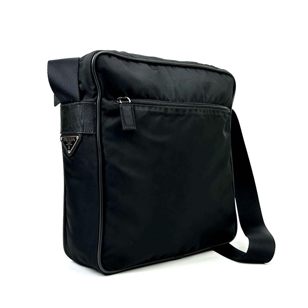 - 極美品 PRADA プラダ 三角ロゴ ショルダーバッグ カメラバッグ シルバー金具 フォーマル ビジネス 男女兼用 テスートナイロン レザー 黒