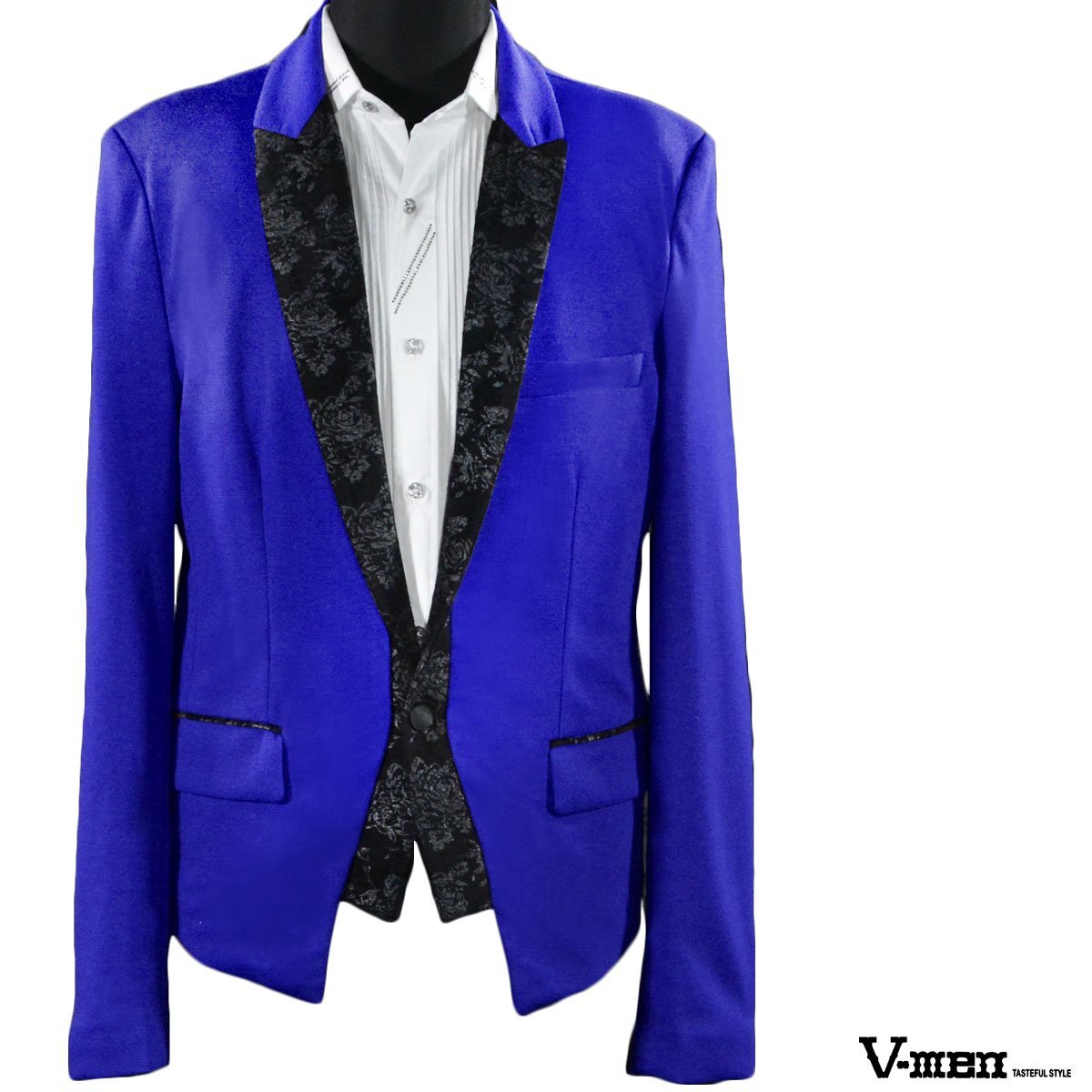 - 952584-25 [SALE] ブイメン 衿花柄フェイクレイヤード ショート丈スペンサー 1釦カットジャケット メンズ(ブルー青) L ステージ衣装