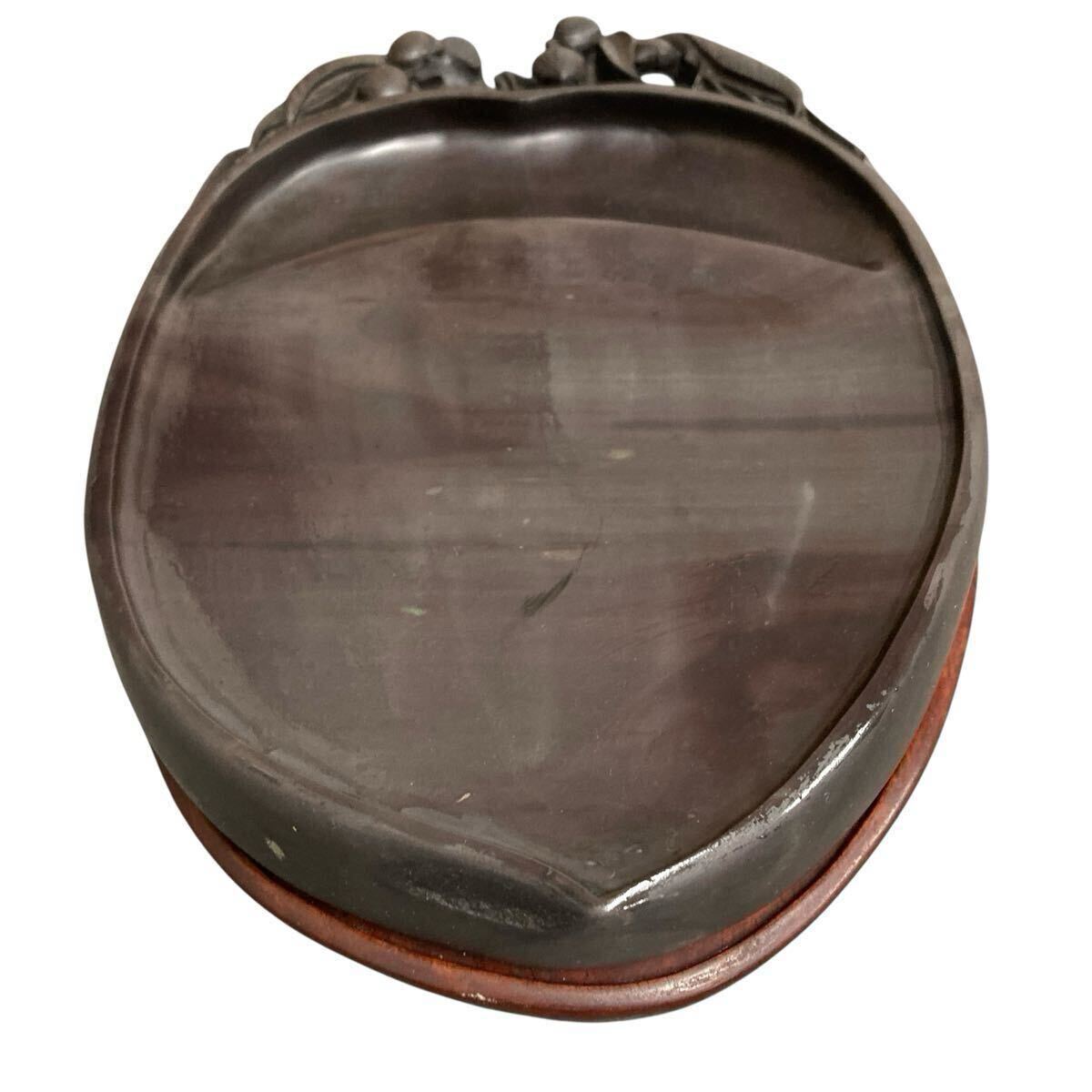 - 端渓硯 桃 桃実 桃形 硯 十吋 唐木 台座 付 青花 天青 火捺 魚脳凍 蕉葉白 臙脂暈 文房四宝 中国古玩 唐物 唐硯 書道具 中国 美術 骨董品