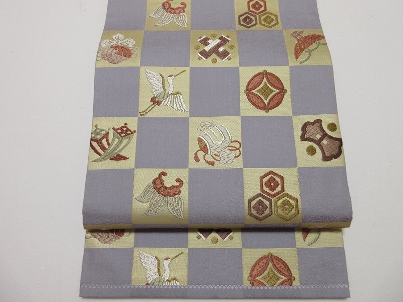 > ドークブア■九寸開き名古屋帯 市松に宝尽くし 鼠 未使用 極上の逸品 B18
