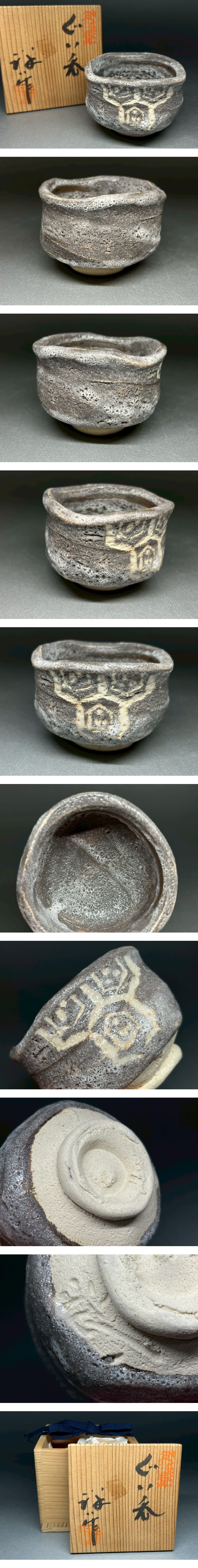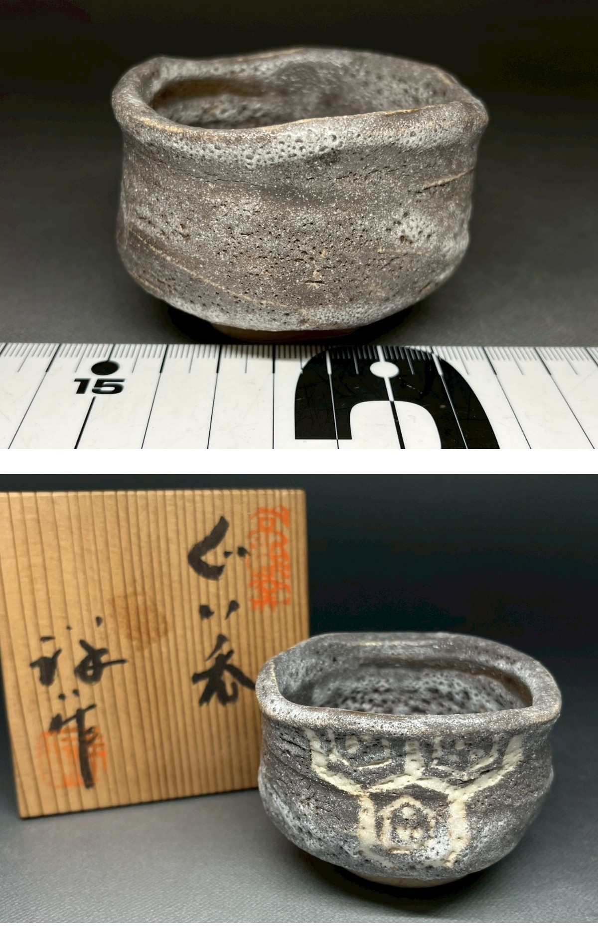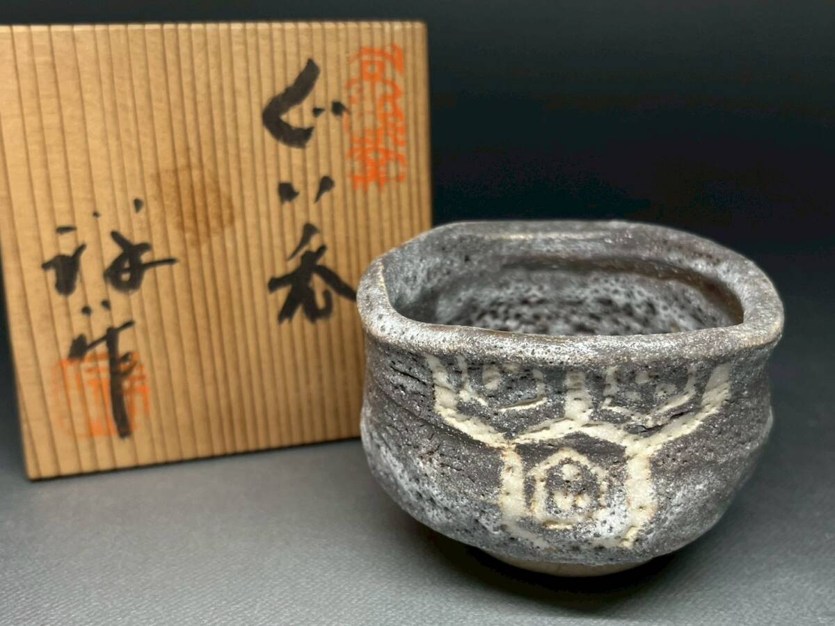 - 某コレクター買取品 ぐい 谷口祥ハ造 灰釉模様絵付抹茶碗 在銘 共箱 古美術品 骨董 置物 飾物 日本伝統工芸品 芸術 古美術 時代物