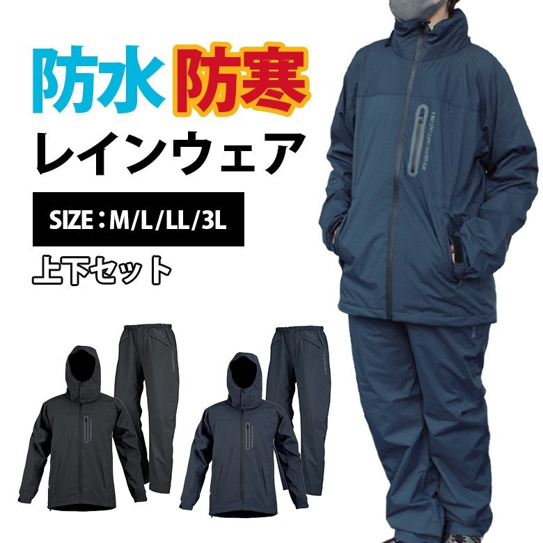 - 防寒レインウェア上下セット(ブラック LL) バイク レインウェア 防寒ズボン ストレッチ 男女兼用 裏起毛