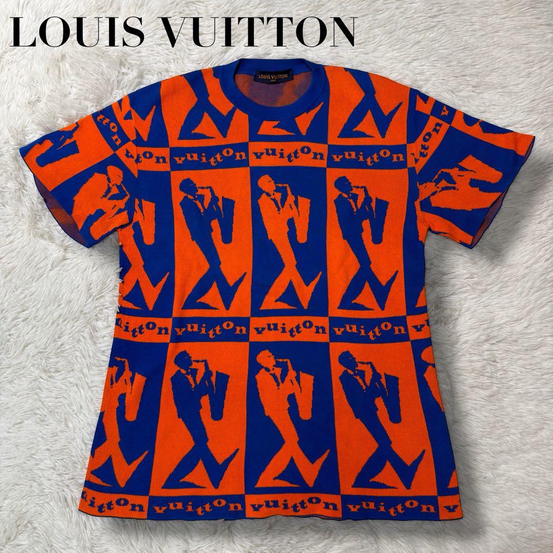 > 超美品 LOUIS VUITTON ルイヴィトン 半袖 コットン Tシャツ LV ジャズフライヤー ニット オレンジ ブルー Mサイズ