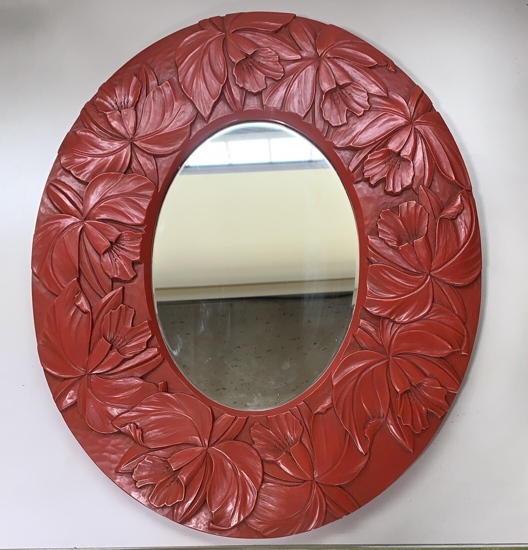 - D1071→鏡 壁掛け ミラー 朱 木彫 楕円形 掛け鏡 壁掛け鏡 木彫り 54.5cm 44cm 昭和レトロ 当時物
