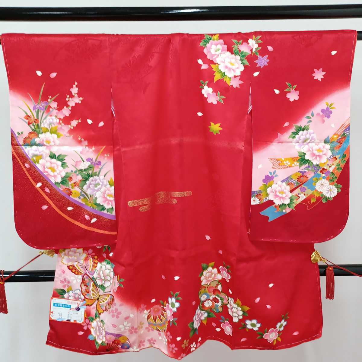 > 【石七94】七五三 着物 襦袢 2点セット 3歳 女児 式典 赤 蝶々 花 華やか 可愛い 220609