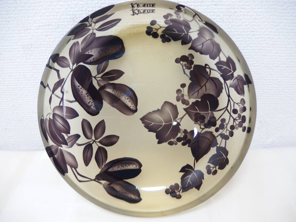 - 8)色被せ 彫刻ガラス 皿 ザクロ ブドウ クリスタル 在銘