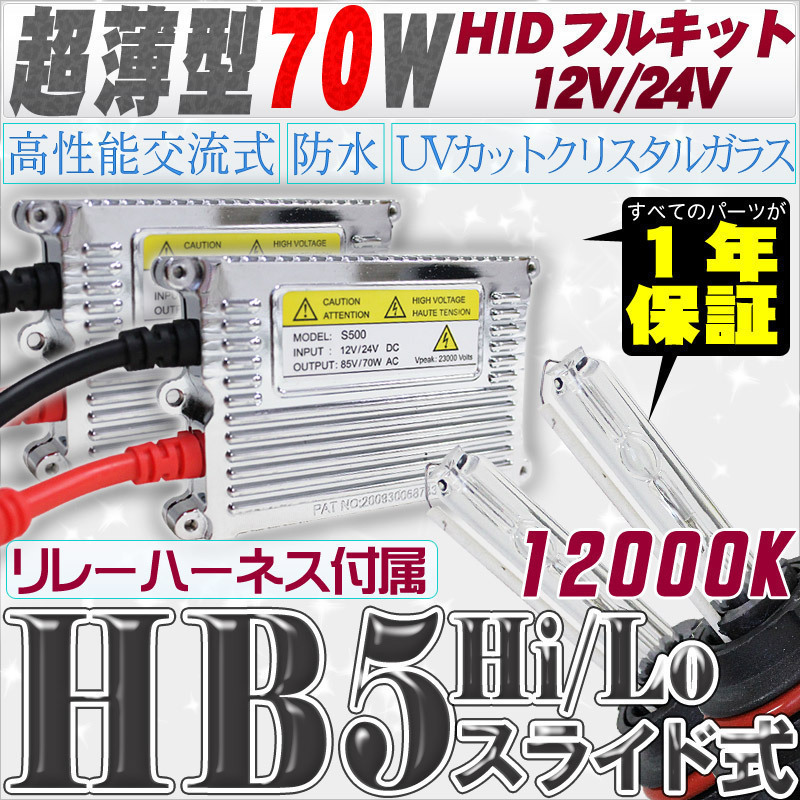 > 高性能 薄型HIDキット 70W HB5 Hi/Lo スライド式 リレー付 12000K 12V/24V 【交流式バラスト&クリスタルガラスバーナー】