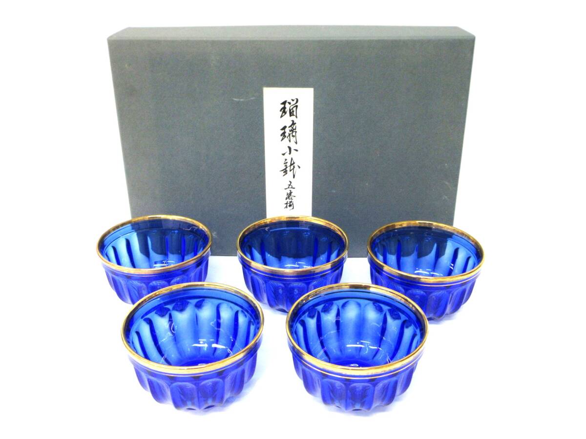 - 【10-10】未使用 HOYA ホヤ 瑠璃小鉢 5客揃 クリスタル ブルー 金彩 ガラス クリスタル