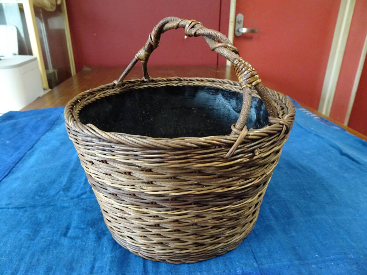 - 1003-4 アンティーク竹工芸 竹編籠/炭籠すみかご 口径24cm/底径20cm/高さ15cm/取っ手高23cm