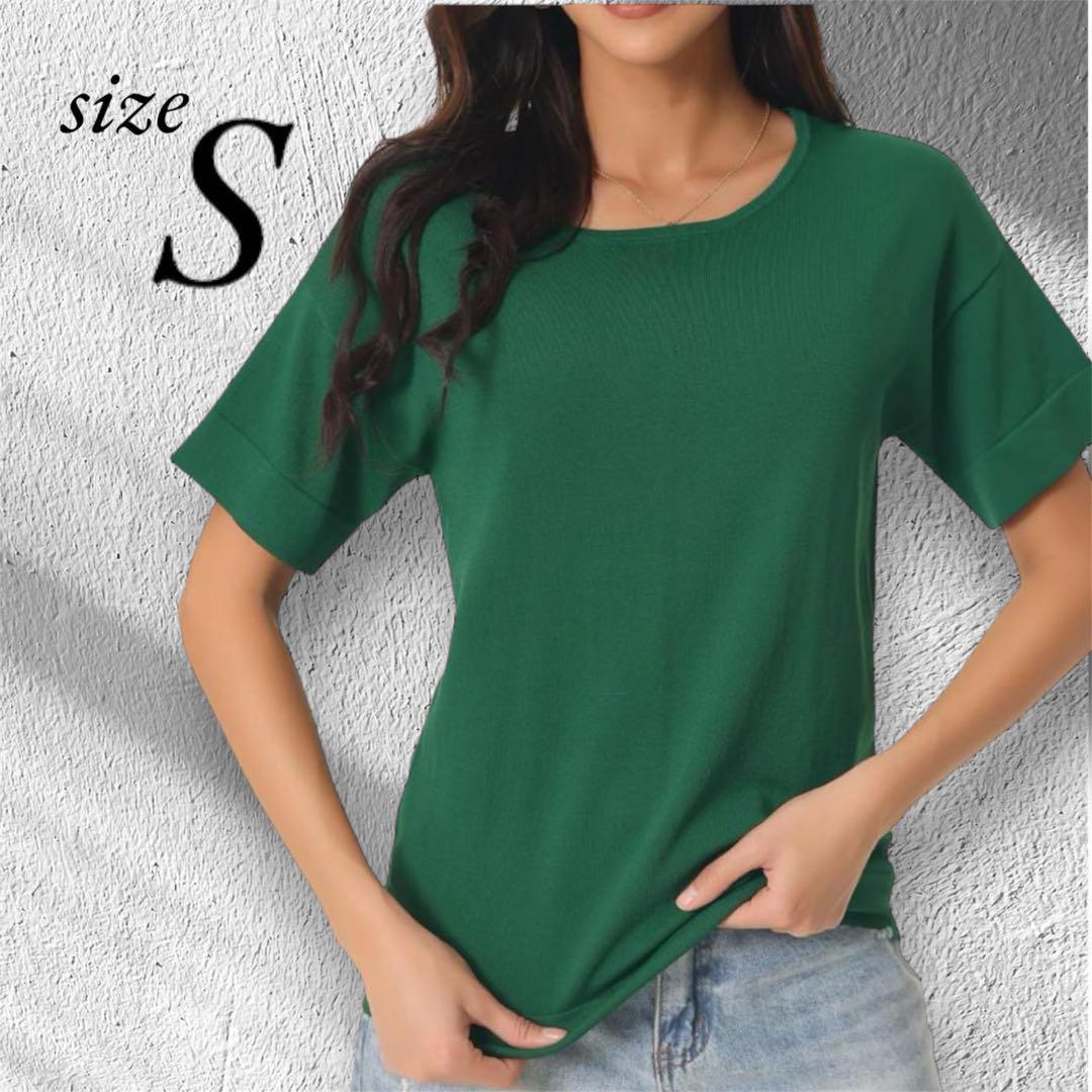 - カジュアル半袖 Tシャツ 緑 S ベーシック サマー ニットトップス 無地