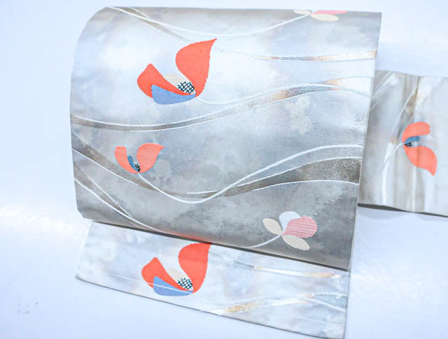 > 《京都一輝堂》【着物】九寸名古屋帯 西陣織 曲線に花文 24B-424