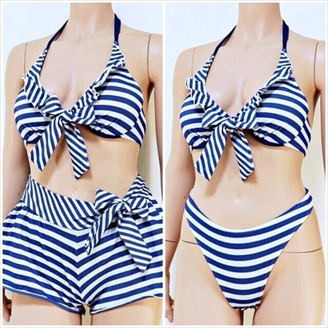 - PX4-204T//紺×白の爽やかストライプ柄☆大きめリボンが可愛い☆マリンテイストのボーダー柄ビキニ3点セット※▲