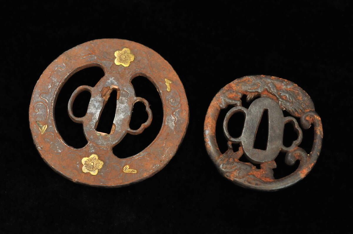 > 【鍔】 2点まとめ 鉄地透かし丸形鍔 無銘 刀用 脇差用 象嵌 総重量:166g 刀装具 拵え 03210008-2