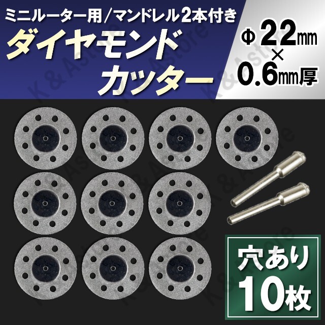 - ダイヤモンドカッティングディスク ブレード カッター ビット 10枚 軸付き 22㎜ ミニルーター用 リューター ハンドグラインダー ドリル