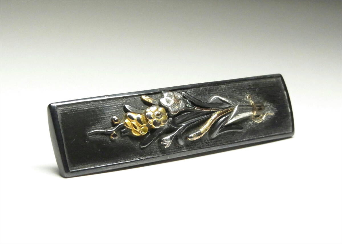 - □和装小物□時代金工 花図 金銀銅象嵌 小柄形 彫金 帯留
